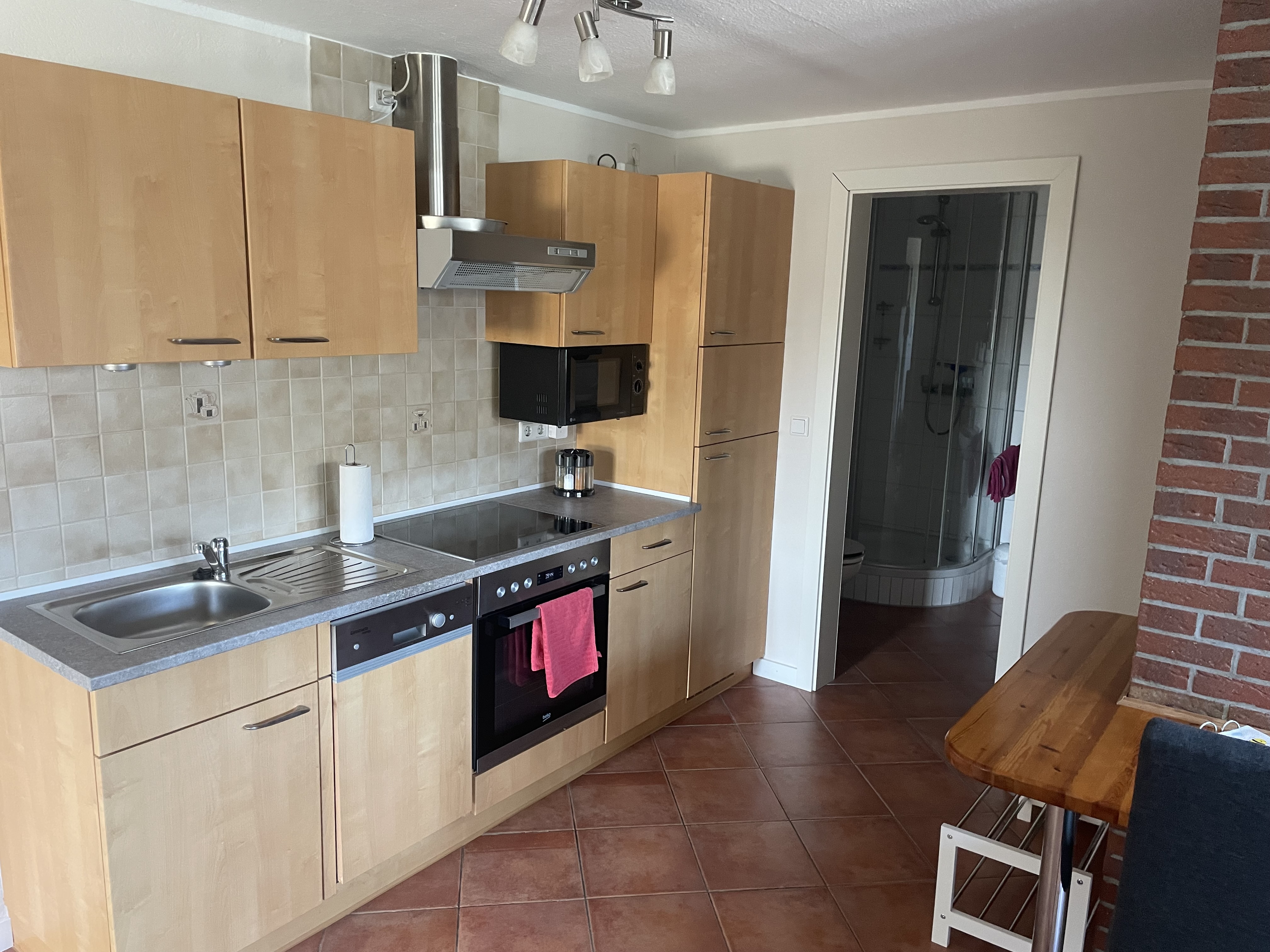 - Wohnraum mit integrierter Küchenzeile (E-Herd-Microwelle-Kühl/Gefrierschrank)